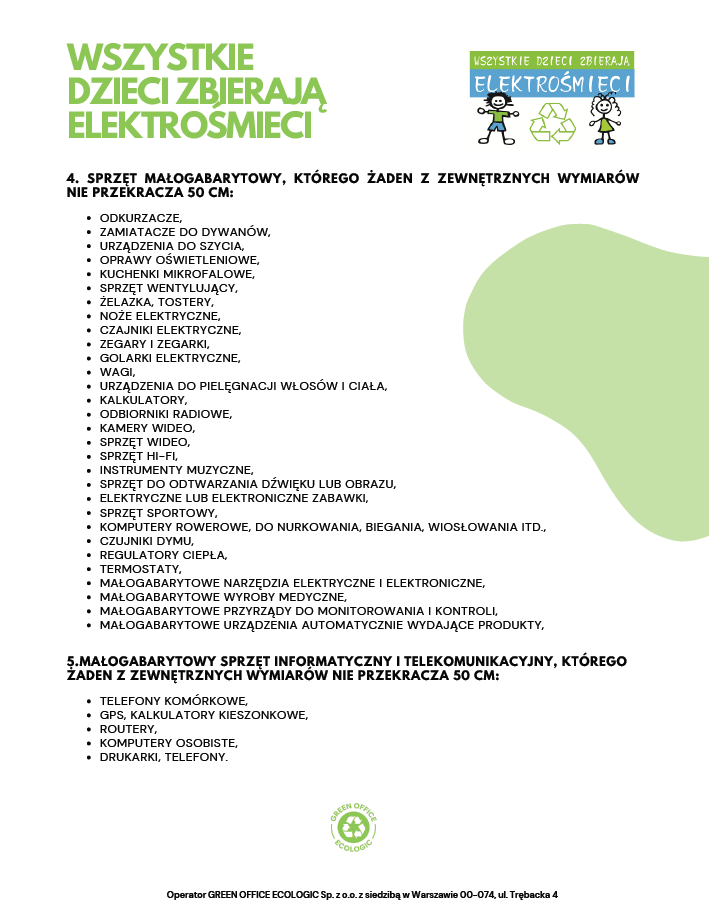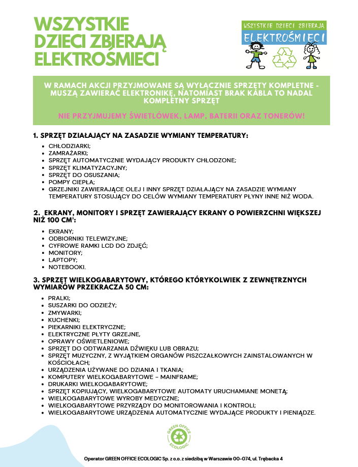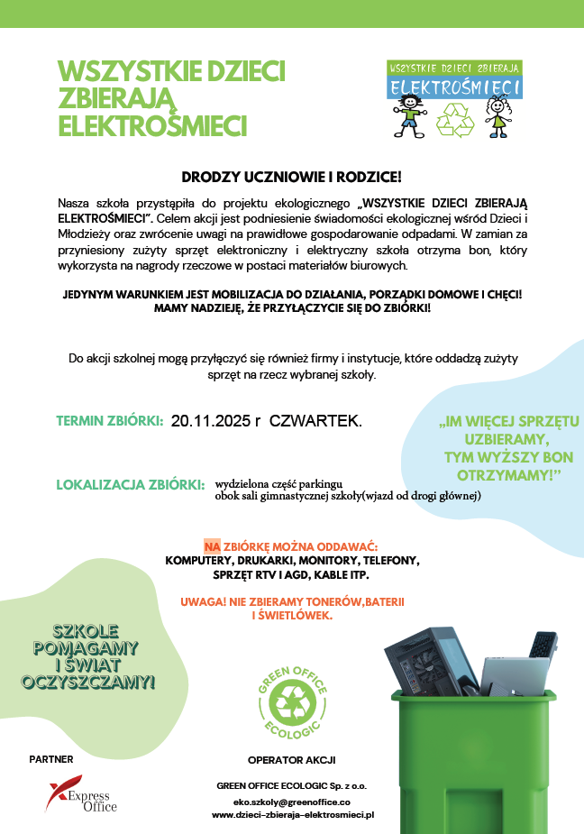 DRODZY UCZNIOWIE I RODZICE! Nasza szkoła przystąpiła do projektu ekologicznego „WSZYSTKIE DZIECI ZBIERAJĄ ELEKTROŚMIECI”. Celem akcji jest podniesienie świadomości ekologicznej wśród Dzieci i Młodzieży oraz zwrócenie uwagi na prawidłowe gospodarowanie odpadami. W zamian za przyniesiony zużyty sprzęt elektroniczny i elektryczny szkoła otrzyma bon, który wykorzysta na nagrody rzeczowe w postaci materiałów biurowych.
