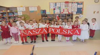 Z okazji 105. Rocznicy Odzyskania Niepodległości dzieci z klasy „0” ubrane w barwach narodowych, wystrojone w piękne kotyliony, zaśpiewały piosenkę pt: „Co to jest niepodległość, recytowały wiersze pt: „Katechizm polskiego dziecka” oraz wiersz „Barwy ojczyste”.